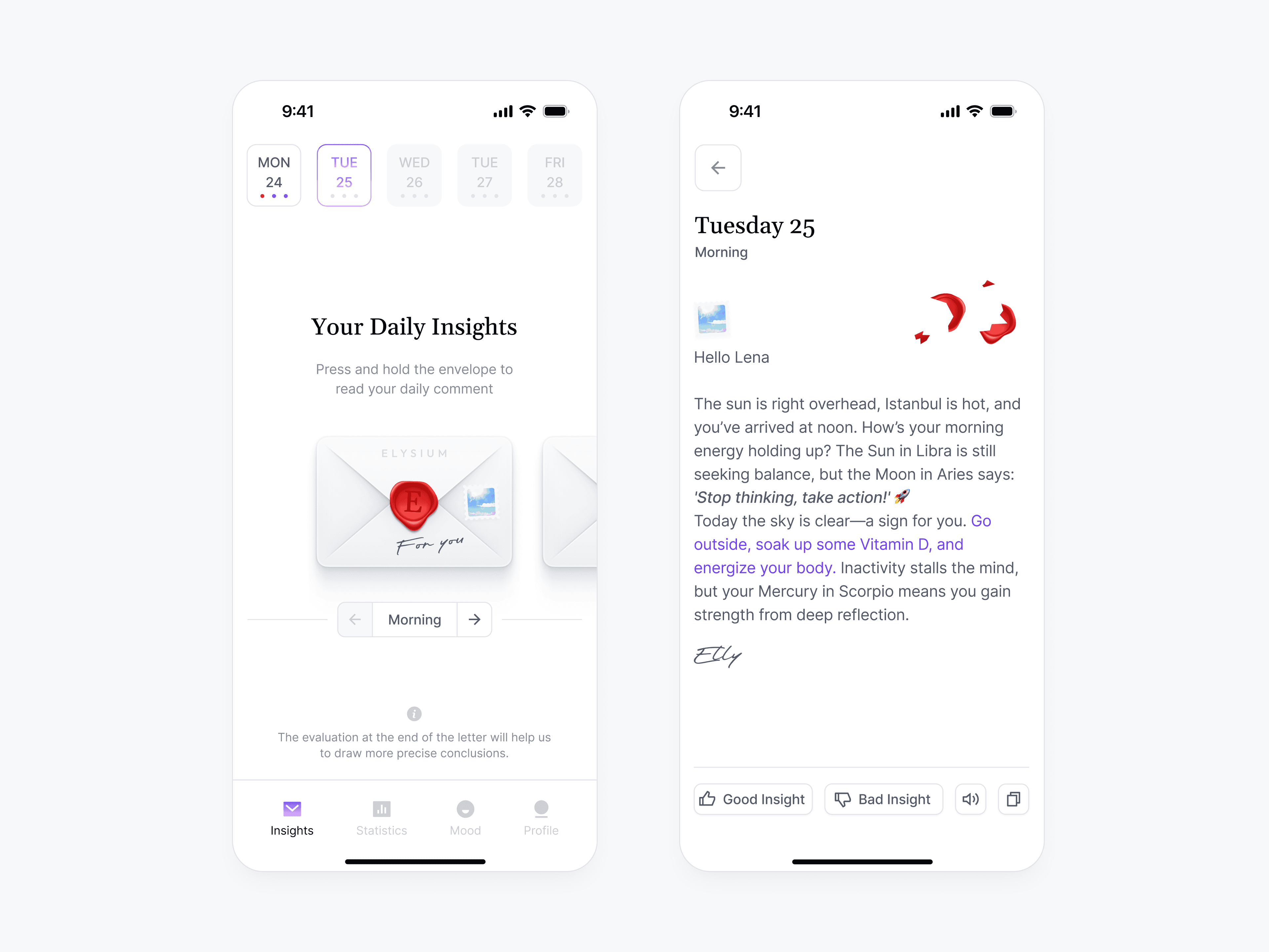 The Daily Insight experience is designed to create a deliberate pause within the user’s day. In Elysium AI, insights are not passively delivered; the user actively opens them. The envelope metaphor reinforces the feeling of receiving a personal message rather than consuming standard content.