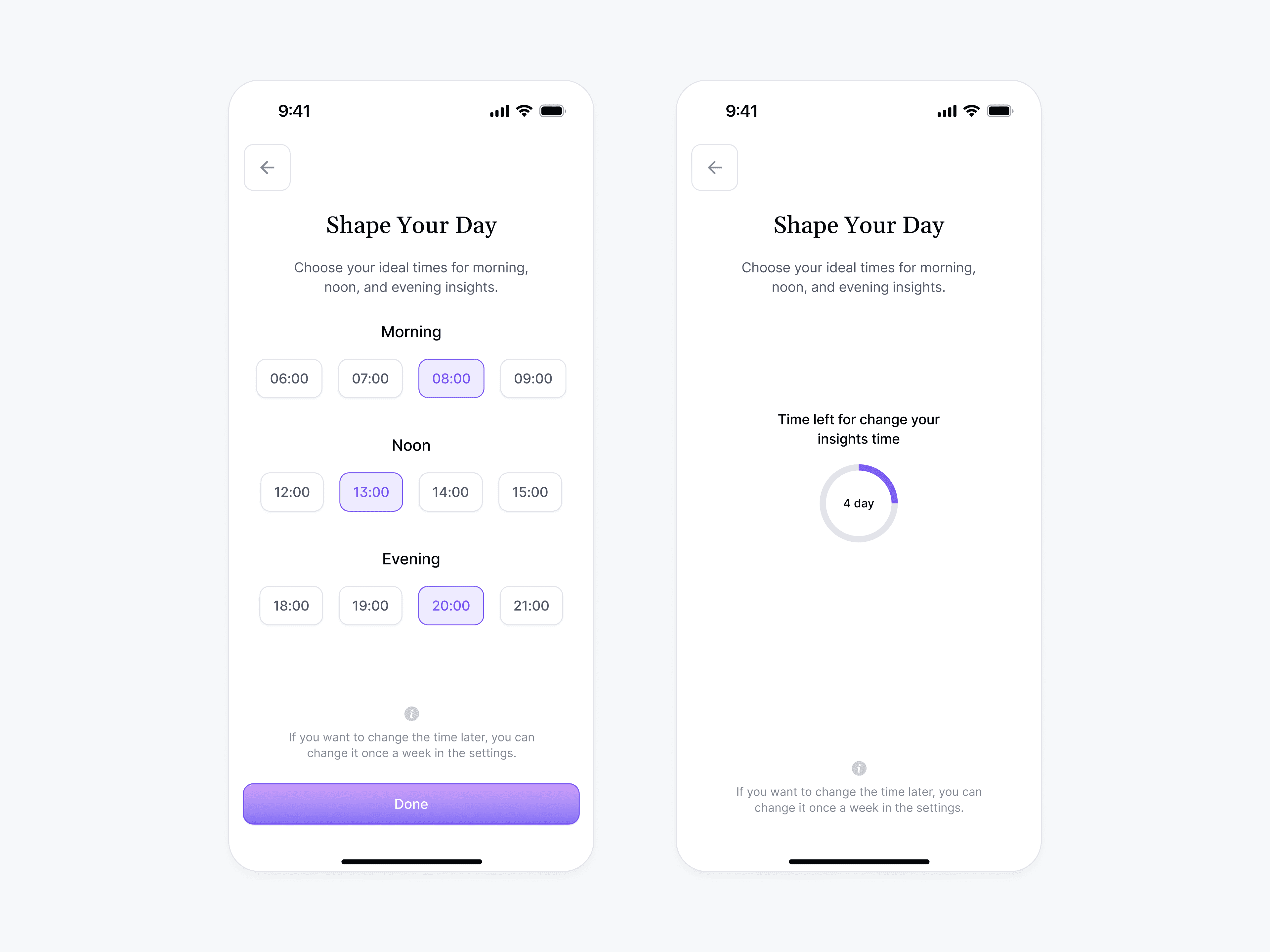 Time selection is presented through a limited set of options instead of free-form input. This reduces decision fatigue while ensuring insights arrive in contextually appropriate moments. Users shape their day without breaking the system’s rhythm.