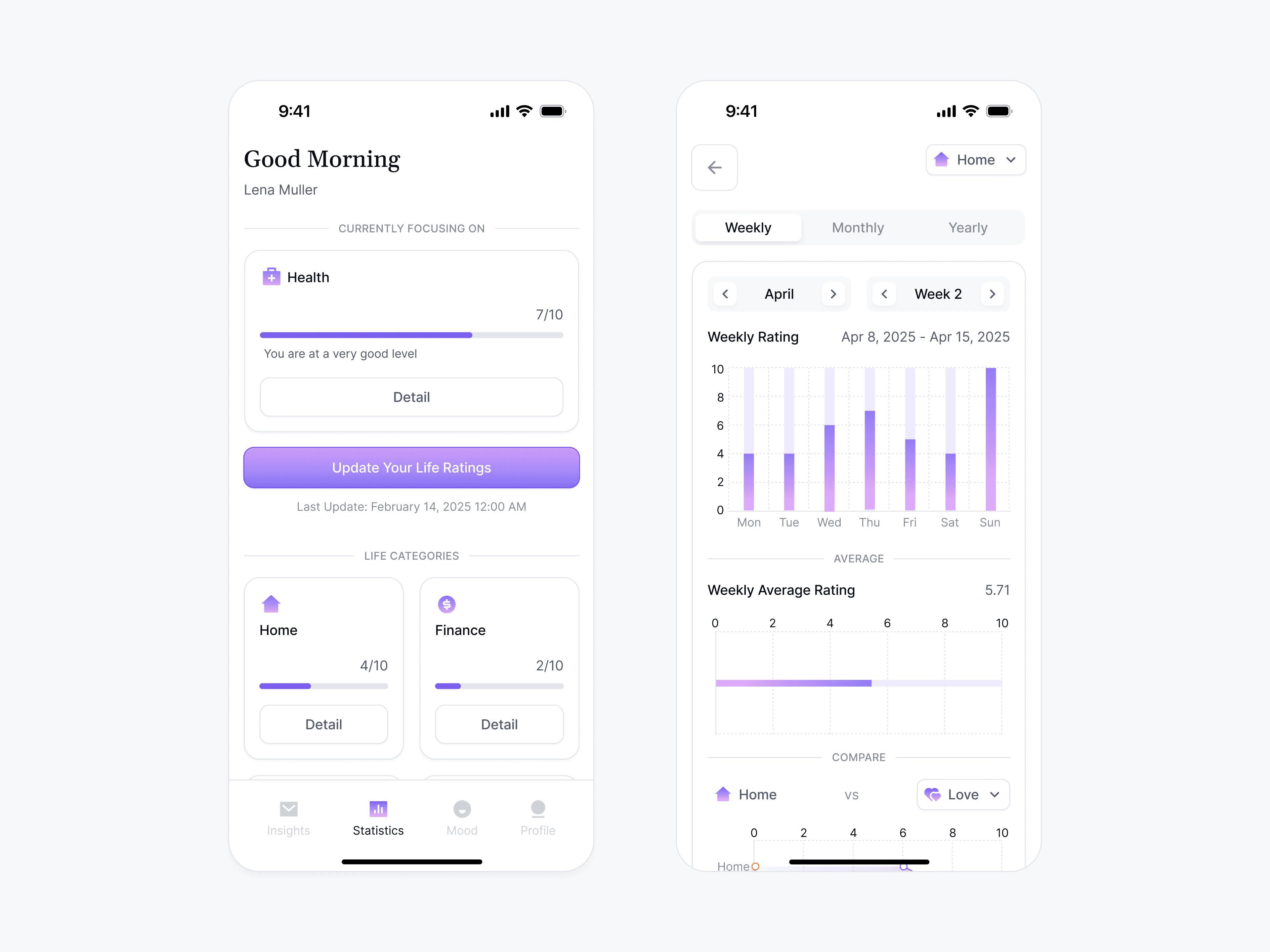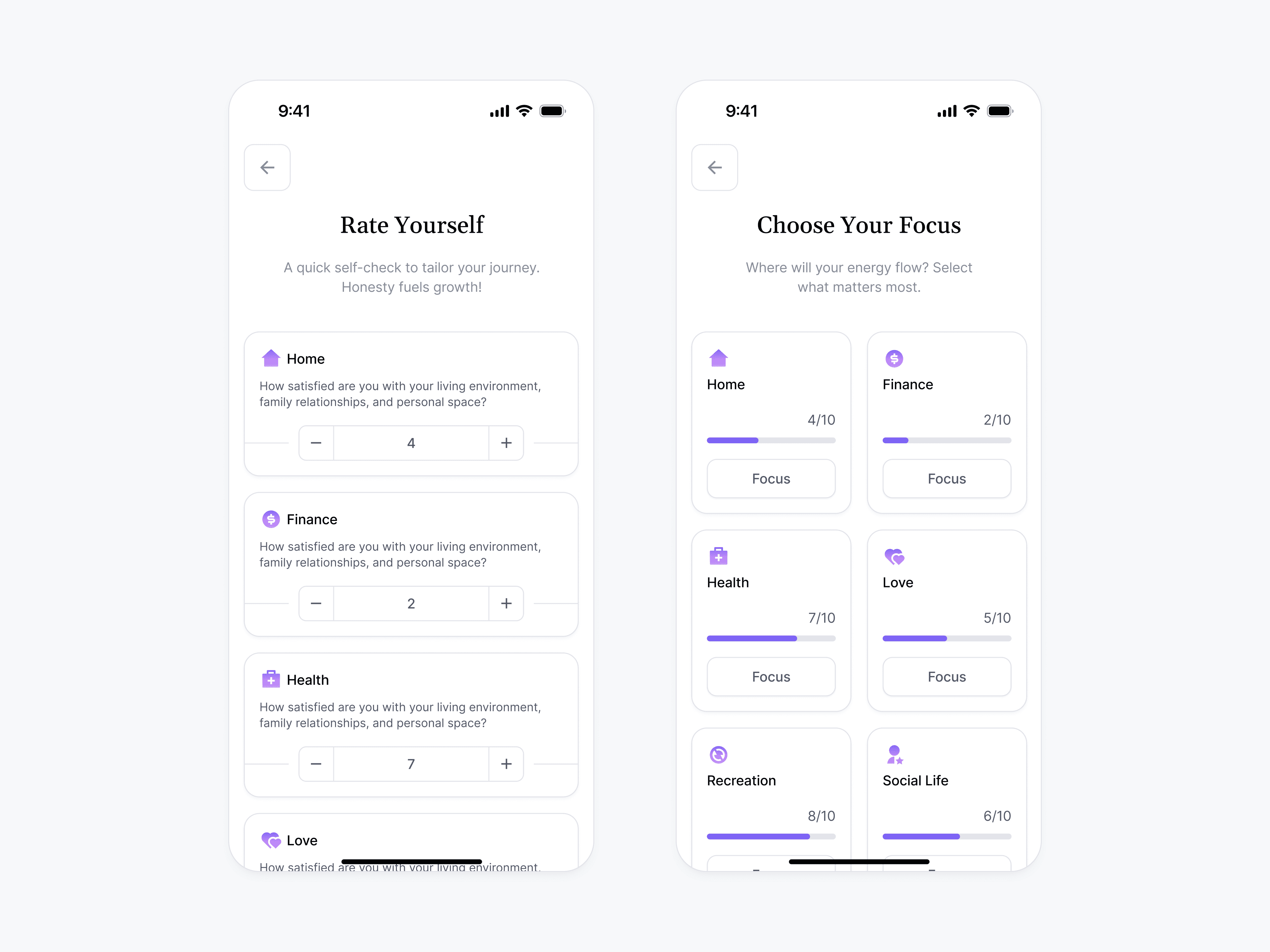 This experience is designed to help users assess their lives without feeling judged. The “Rate Yourself” step is not a test or evaluation, but a moment of self-awareness. Scores are entered using simple plus and minus controls instead of sliders, prioritizing intentional choice over speed.