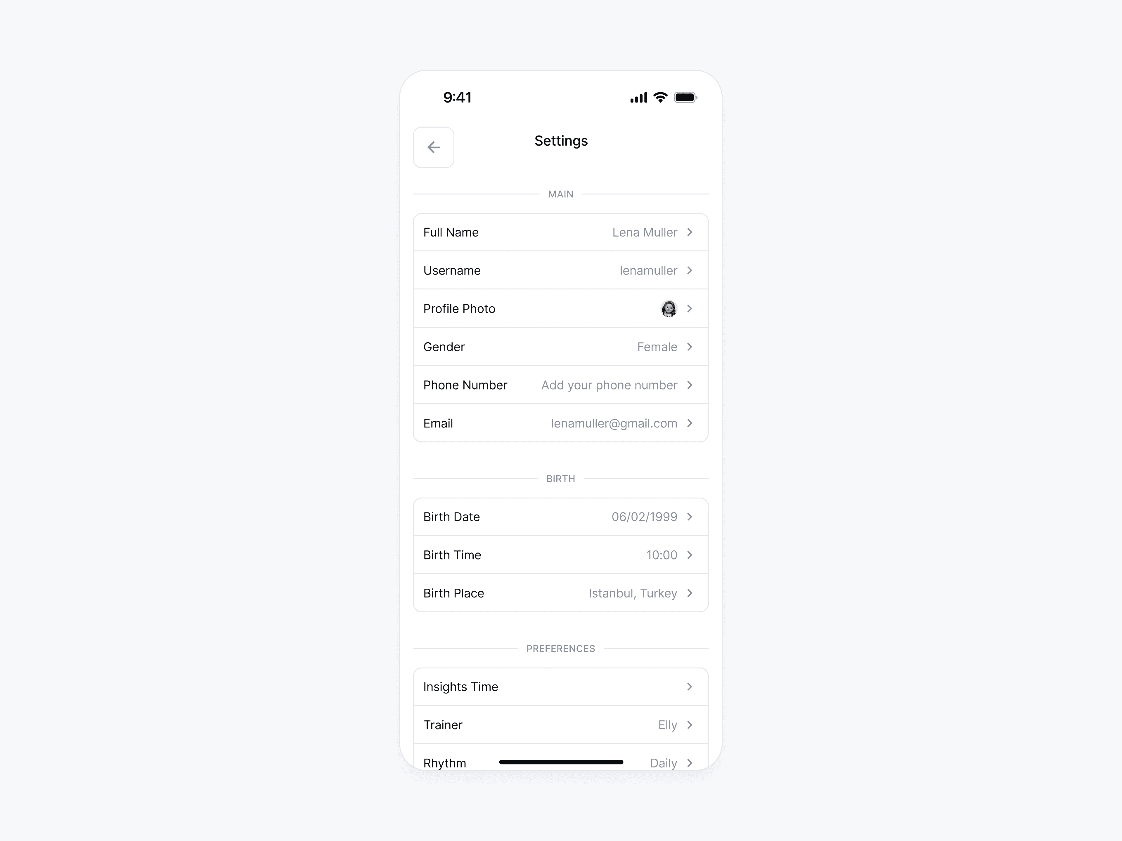 Birth information is placed in a dedicated section. Date, time, and place of birth are used to improve astrological and contextual accuracy. Separating this data emphasizes both its sensitivity and its purpose.