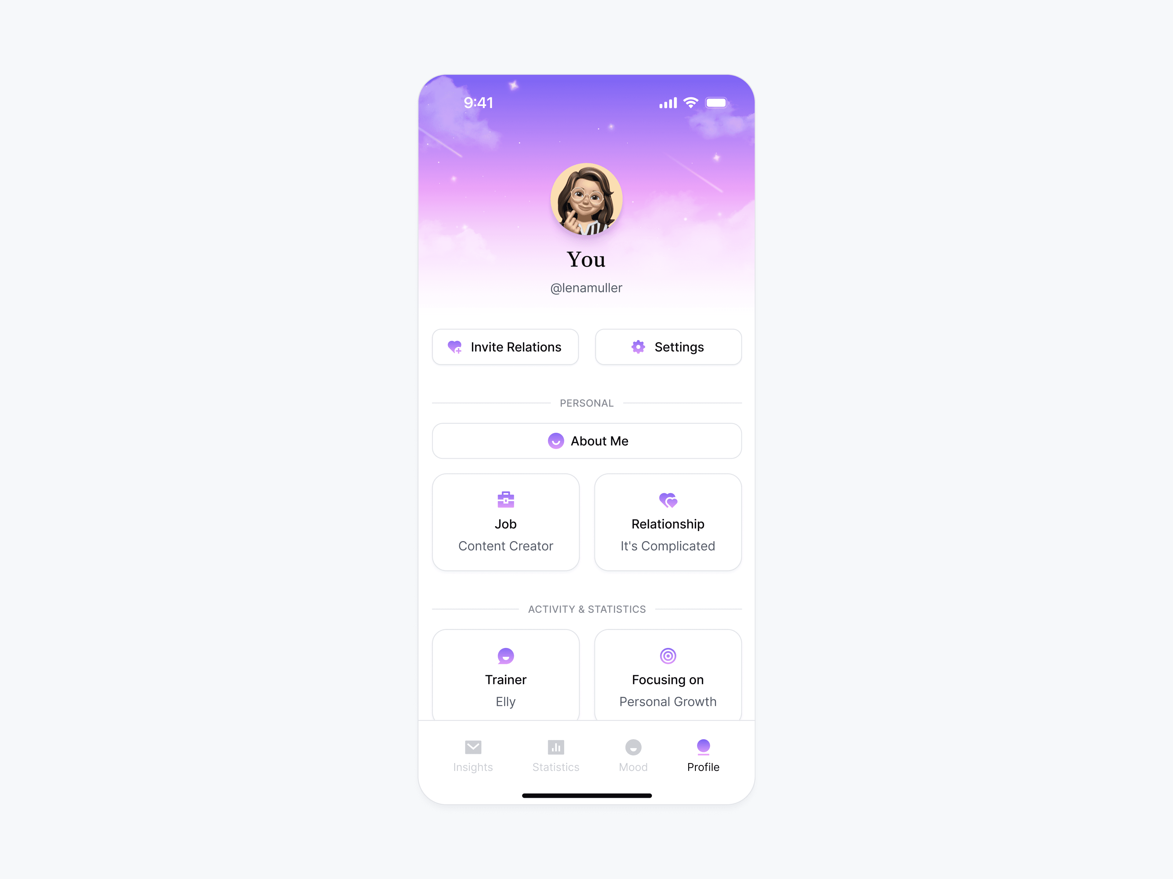 The Activity & Statistics area makes the user’s ongoing relationship with the app visible. The Trainer field integrates the selected mascot into the user’s identity. The Focusing on indicator reinforces the current priority and maintains alignment across all guidance and insights. The short message from the mascot strengthens the sense of an ongoing dialogue.