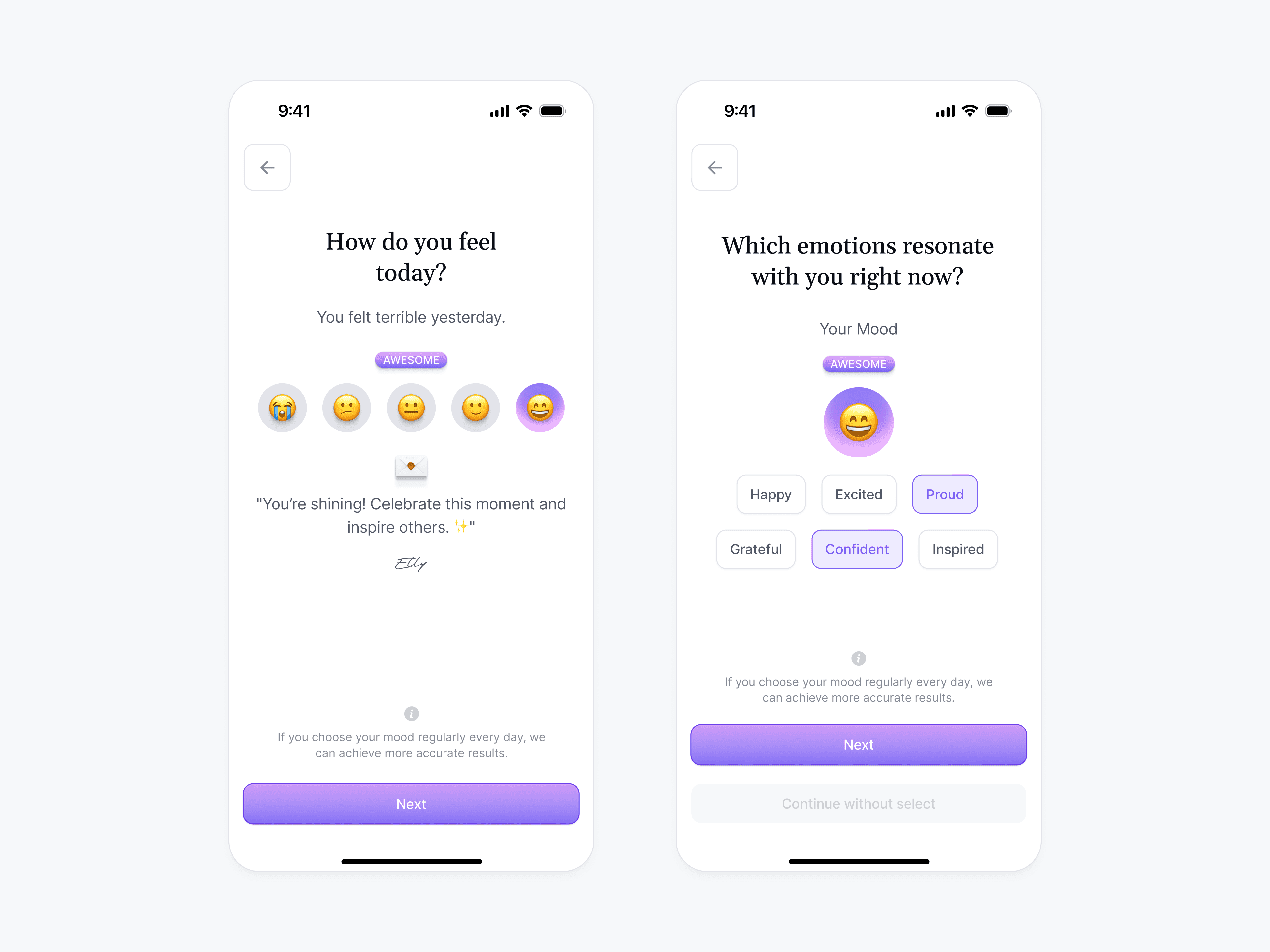 Mood selection is optional. Users can continue without making a choice. This decision supports trust and habit formation instead of forced data entry. Transparency about improved accuracy through regular check-ins is provided without pressure.
